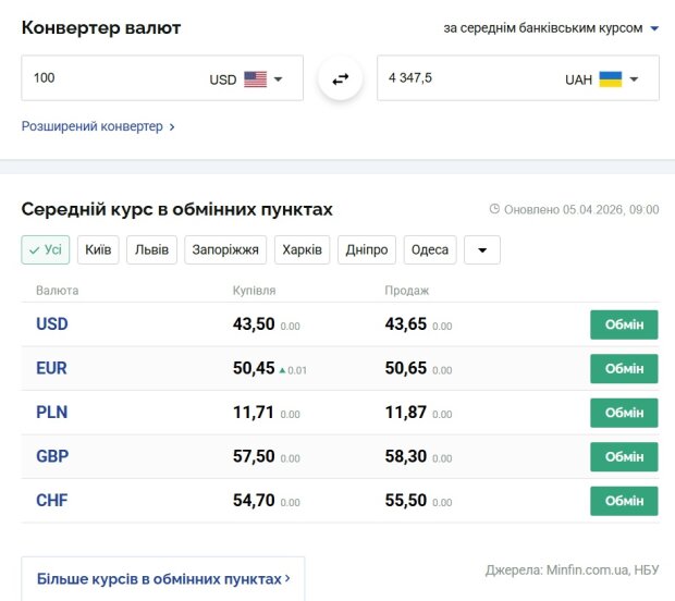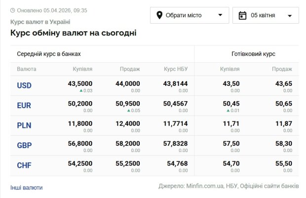 Курс валют в Украине 5 апреля 2026 года