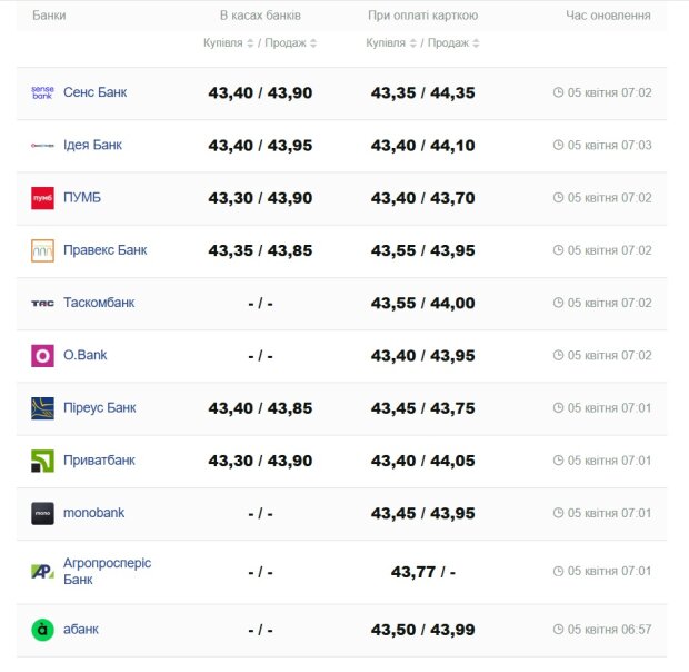 - Приватбанк: 43,30/43,90 грн за доллар.